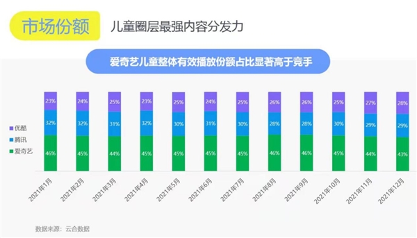 与此同时,在少儿内容观看偏好中,智能电视占据显著地位,视频平台自制内容如何分发至电视台播出,就需要内容有相对的竞争优势。云合数据显示,2021年爱奇艺儿童整体有效播放市场份额显著高于其他平台,占比最高达46%,排名行业第一。长视频平台占据行业引领地位,而在内容分发上,爱奇艺也凸显出行业布局实力。