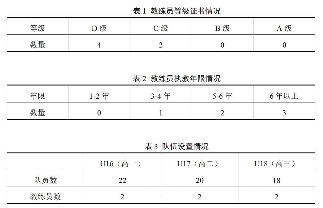 绿光足球俱乐部拥有执教经验和带队经验丰富的教练员团队,每个梯队均配有2名教练员。教练团队中有洛阳一高体育教师1名,是球队的主教练同时也是洛阳一高体育组组长,拥有教师资格证和和较高的教练员等级,在负责球队训练的同时每天也要负责洛阳一高的体育课程,另有外聘教练5名。他们当中的大部分拥有专业运动队或职业梯队的运动经历,具有较高的执教水平。通过调查了解到教练员的年龄在30-35岁,处于高水平教练员的黄金年龄,但教练员等级D级居多,因此教练员需要通过规范系统的培训,不断提高教练员的等级[13]。