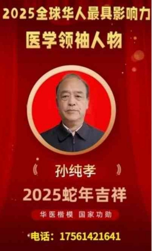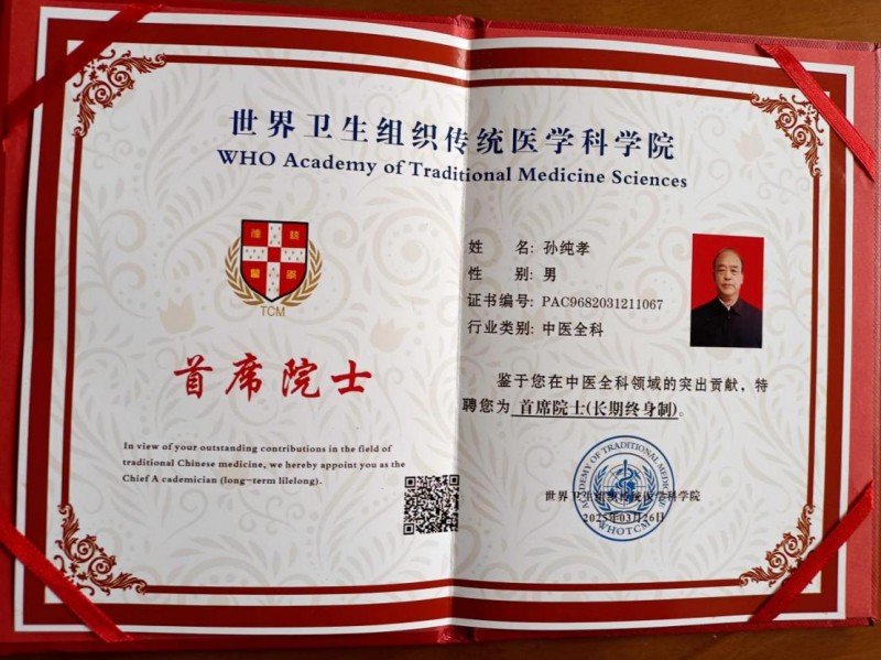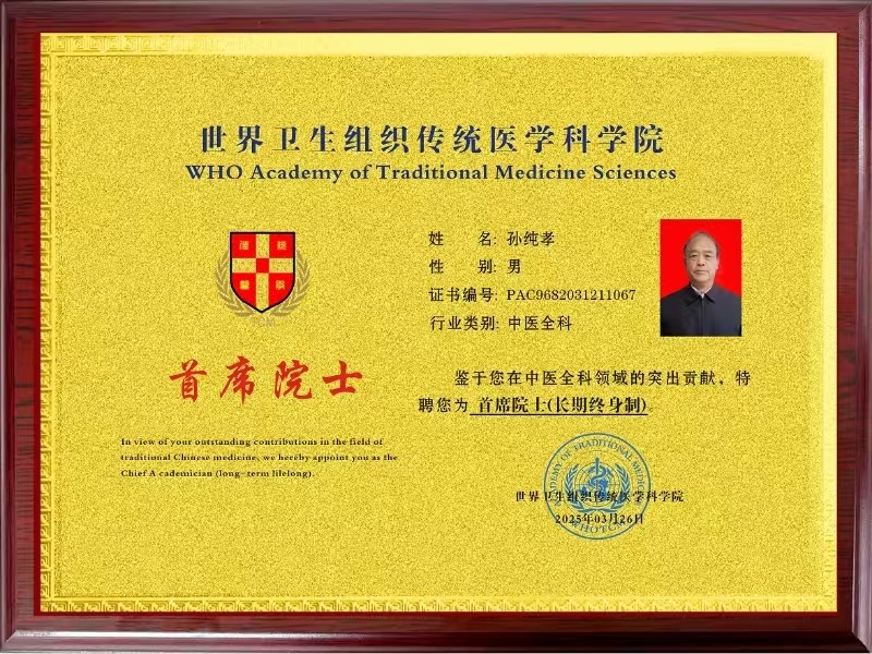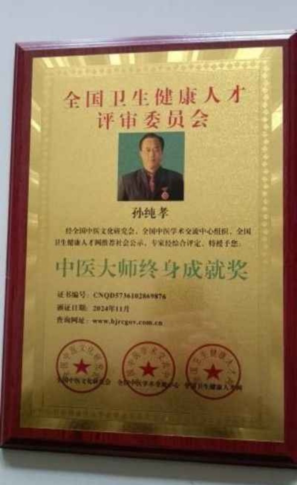 孙纯孝老师满怀赤诚的经营着中医的人生梦想,将自己的真情倾洒在中医学这块肥沃的土地上,用他独具一格的思维模式和行动魄力,铸造了一代中医名家的传说,善心行事全心奉献,在相融共生的历程中描绘出异彩缤纷的发展风景线。作为一位医务工作者,孙纯孝老师把中国中医继承好、发扬光大作为自己的奋斗目标。数十年不忘初心,一路前行,孙纯孝老师一直在践行自己肩负的使命造福民众,弘扬中医。在其全力奋进之路上,他做出了重大的贡献弘扬祖国的中医传统文化推动中医传统文化的发展,造福人类,孙纯孝老师作为中医行业内领先人物,用新一代的传承人精神去诠释中医的精髓,去发扬中医的光辉去传播中医的智慧,守护人民健康。传承好中国传统医术,惠万家幸福,助祖国强盛。