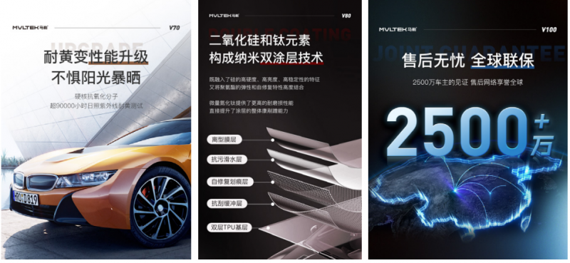 隐形车衣也被称为“漆面保护膜”,是一种可以直接贴在车漆上的一层透明的弹性软薄膜, 属于汽车美容服务范畴。该产品能有效隔绝车漆与外界有害物质的接触,从而达到更好地保护车 漆的效果。MVLTEK 马勒漆面保护膜,具有其他车衣无可比拟的耐久性和抗划伤性能,同时具备 保护汽车表面日常不受磨损、石块和其他恶劣天气因素的侵害,还能够有效抵御紫外线对汽车表 面造成的损伤,进一步防止车漆褪色和氧化,从根本上延长汽车的寿命。杨洋介绍道:“MVLTEK 马勒漆面保护膜采用最先进的材料和最前沿的技术,其中,TPU 材质的划痕自修复功能能够全方 位保护车漆不受损伤,不论是剐蹭,还是遇到酸雨等,都能够使得车漆保持亮丽如新。MVLTEK 马勒漆面保护膜产品性能稳定,产品一经推出,便受到了广大消费者的喜爱。而我们是 MVLTEK 马勒漆面保护膜中国唯一代理商。选择该款产品,也是由于该款产品的品牌理念和使命与我们公 司的发展愿景不谋而合,在我看来,只有竭诚为民,秉承初心为客户提供物超所值产品的企业才 值得与之同行。同时我们也将延续 MVLTEK 马勒漆面保护膜的品牌使命,致力于为消费者提供优 质平价的顶级产品,持续为客户创造终生价值。”