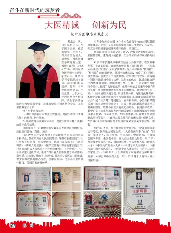 拥有膏丹丸散的研究基地本草堂平安堂,膏丹丸散的临床基地,临床基地绵阳市游仙区戴东云诊所。在外科疮症方面采用中医“膏丹丸散”外用优势加西医外科手术的优点,并把病程分为三期:1.脓未成期以消为贵,用拔毒散外敷,内服清热解毒剂。2.脓已成期采用西医外科手术切开引流。3.脓溃后期采用“绿水丹”或“红升丹”等提脓生.在骨科方面,小型骨折早期采用中医小央板对位固定5—10天,待局部肿胀消退采用石膏夹板固定,取其各自之长有机巧妙结合,收到良好效果。其中论文《探索伤寒经方运用的关键点》荣获国际医学交流成果金杯奖、国际论文奖,2009年荣获《世界重大学术创新成果特等奖》。《膏丹丸散在外科的临床应用》荣获文奖,2007年10月在全国医药卫生科技成果交流会荣获成果一等奖。