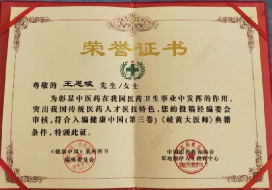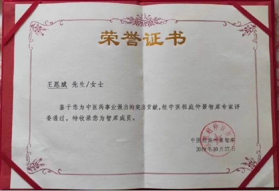2019荣获第十届全国名老中医绝技演示交流大会特邀嘉宾。2019被收入中医祖庭仲景智库成员,并获得中国针灸协会颁发的传承证书。