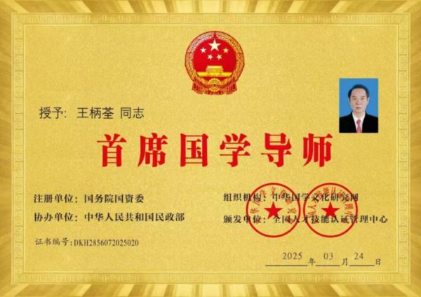 2025年3月24被国务院国资委,中华人民共和国民政部,中华国学研究网,全国人才技能认证管理中心等4家授予首席国学导师的荣誉称号。