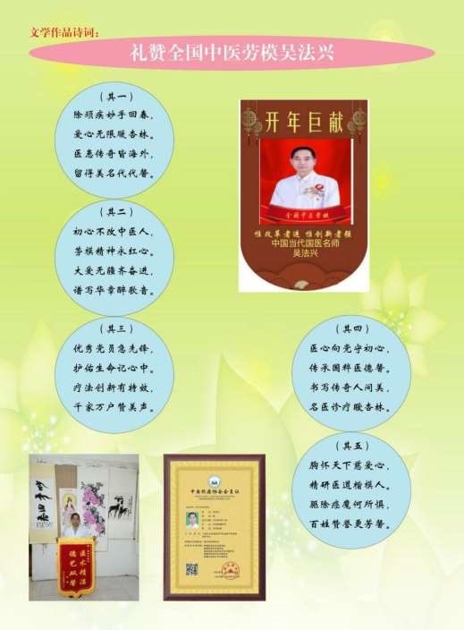 吴法兴老师于这功在当代利在千秋的中医传承行业中,从无怨言,不追名,不逐利。凡事都致力于做到尽善尽美,医所痊愈。吴法兴老师以“大医精诚”为格言,不断精益求精,将“传统中医文化开枝散叶满华夏”的愿景早日实现,也相信越来越多仁心博爱的年轻人和有志之士能以此为旗帜和榜样,在同一片蓝天和同一面旗帜下,传承好中国传统医术,惠万家幸福,助祖国强盛。