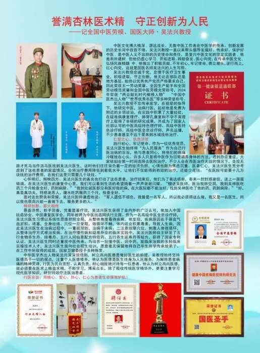 从医多年,吴法兴医生始终将医德牢记于心,心系百姓。在几十多年的行医生涯中,他用精湛的医术和爱心,拯救着一个个鲜活的生命,重塑着无数患者的信心,使他们重获健康和幸福!