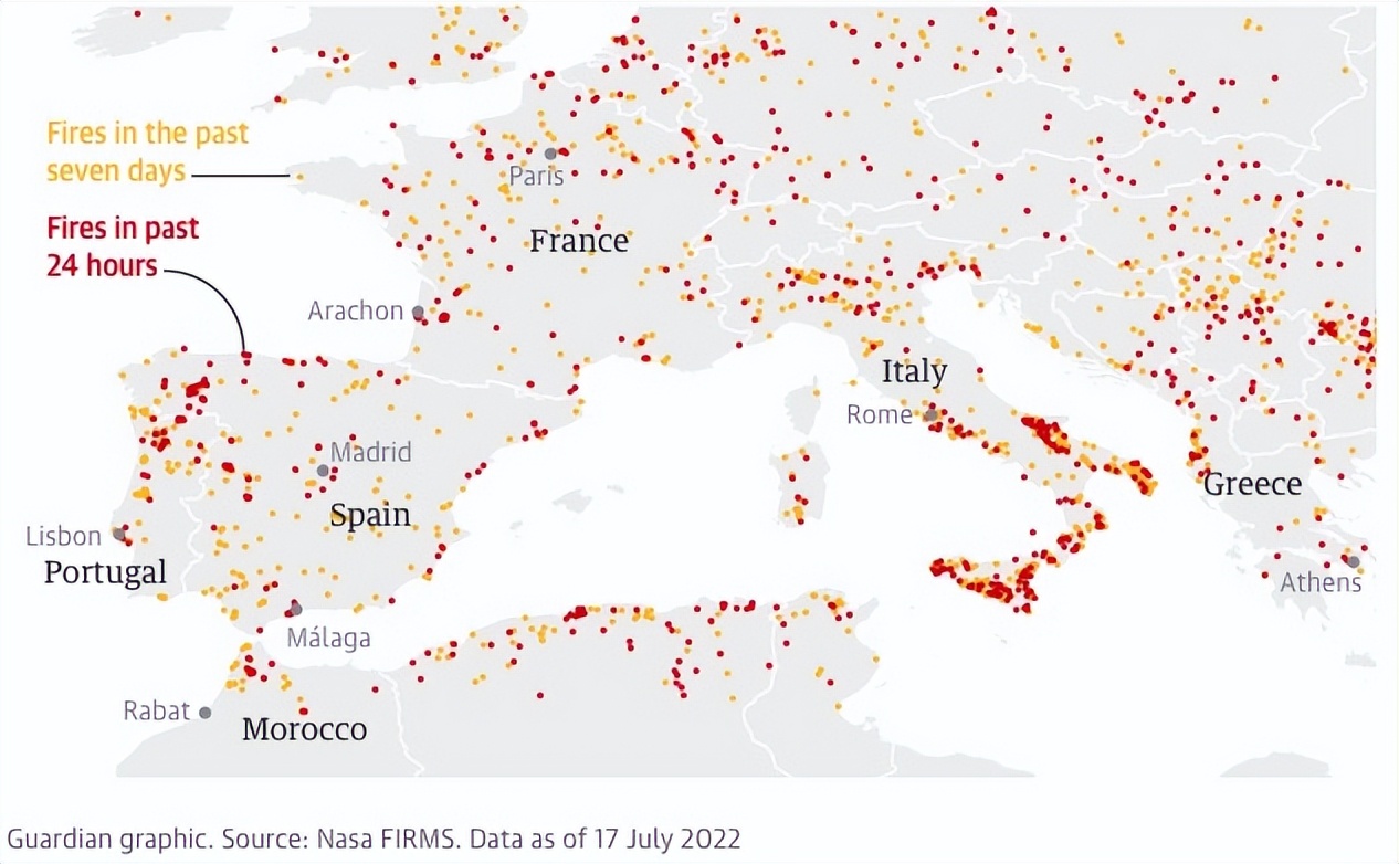 据近段时间来ABC、BNO等多方媒体报道,包括法国、西班牙、葡萄牙等多个欧洲国家陷入了致命高温“魔咒”。就自然层面来说,一直高温不下,甚至出现了高达47℃。此外,高温引发的“蝴蝶效应”——森林大火在西班牙、葡萄牙接连发生,外加“野火”不断,这让形势更加严峻。