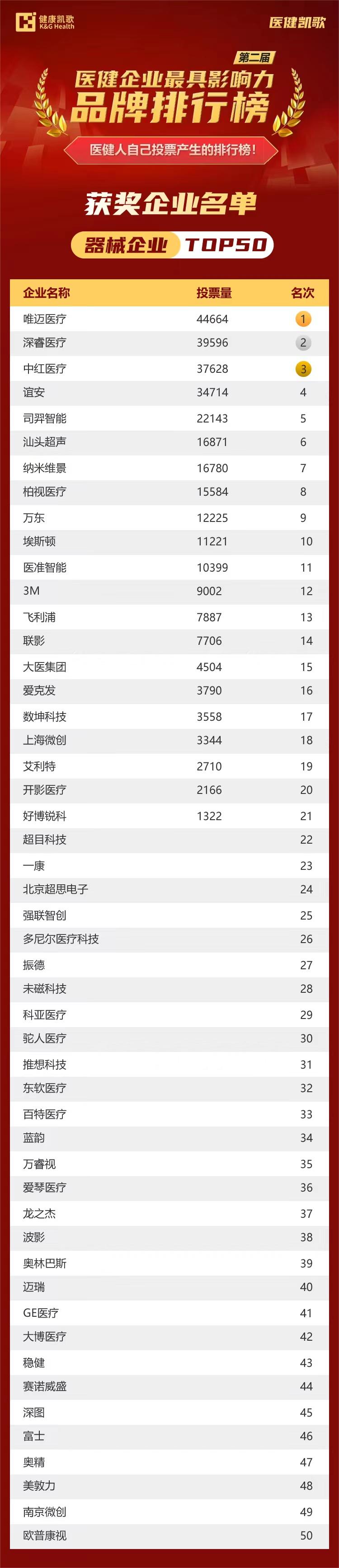 医健凯歌排行榜由健康凯歌于2021年创建,旨在遴选出医健行业人士心目中最具影响力的企业,是医健人自己投票产生的排行榜!2022年第二届医健凯歌影响力排行榜于11月1日开启,经过7天的企业征集,到11月8日开始正式投票,至11月21日晚22点截止,总票数116.5万+,访问量174.2万+。