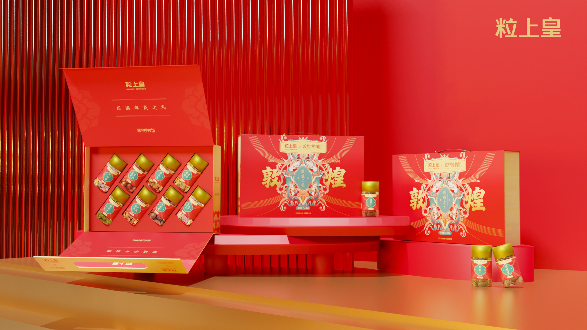 在今年,粒上皇关注到年货购买人群和用户对于传统国风喜好需求,粒上皇首次携手千年文化隗宝IP敦煌博物馆联名打造礼盒包装,让敦煌文化瑰宝“穿越”千年,现身在粒上皇的年货礼盒上,以一种前所未有的形式焕发别样光彩,