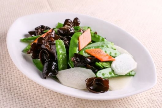 起锅热油、先放胡萝卜翻炒、再放入焯水之后的山药木耳以及荷兰豆一起翻炒片刻
