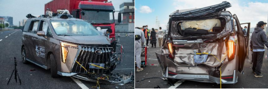 在中汽传媒的碰撞试验下,8.6吨重型货车以45km/h的速度追尾传祺M8宗师,M8宗师在被追尾后撞击前方重型大卡车的车尾,最终M8宗师车头“扎”进大卡车下方,车尾部受到很大的冲击。