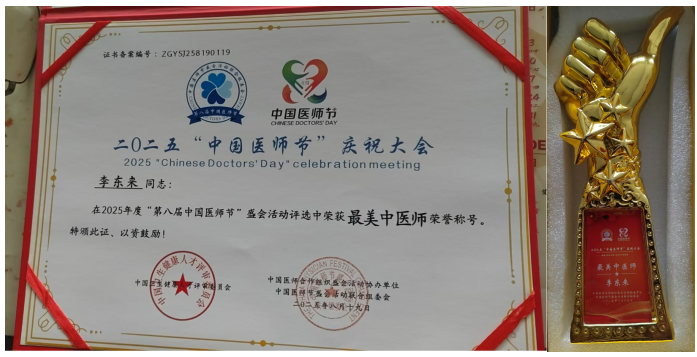 2025 年,“十全延生技术” 通过国家标准委员会权威认证,同年 4 月,李东来医师受 CCTV 邀请,担任中央新影《榜样力量》栏目嘉宾;在8月19号“第八届中国医师节” 盛会上,他更是荣获 “最美中医师” 荣誉称号,这份荣誉是对其医术与医德的高度肯定。
