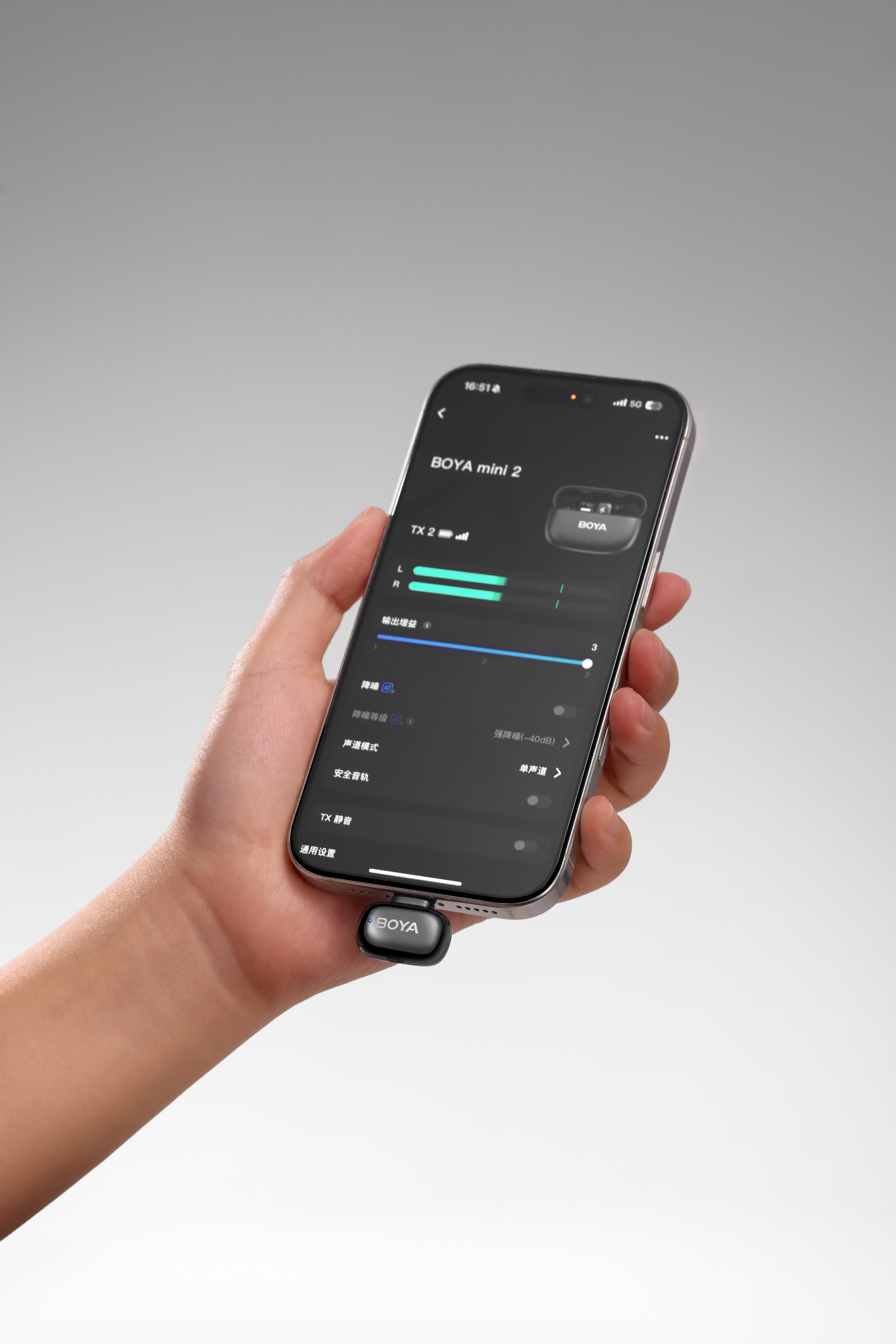 通过BOYA Central APP,用户可调节增益、降噪等级、声道模式、EQ音效等,支持固件升级,持续优化体验。BOYA mini2还具备低切滤波、静音开关、免插拔外放等实用功能,全面覆盖创作需求。