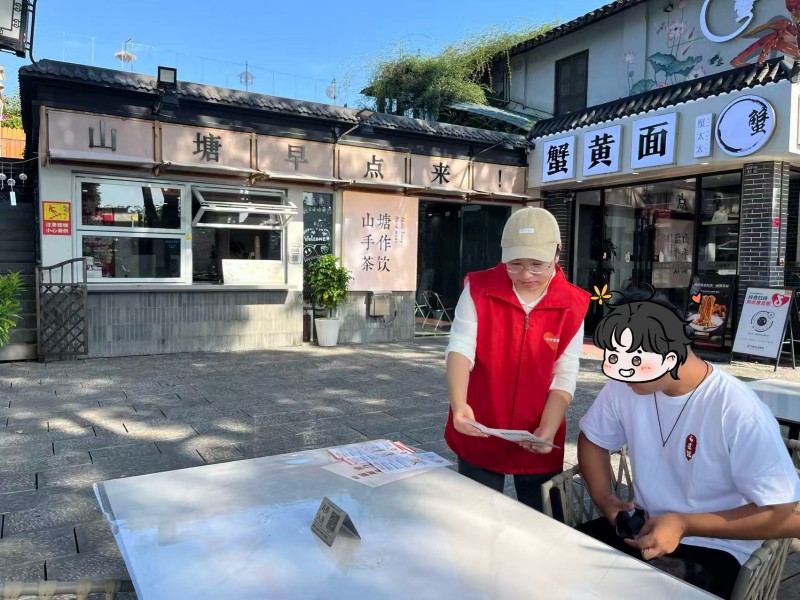 山塘街作为苏州知名的历史文化街区,聚集了大量餐饮、文创、零售等小微商户,由于日常经营繁忙,不少商户对新型金融诈骗手段了解有限,成为风险防范的薄弱环节。活动当天,志愿者们沿着山塘街的廊棚商铺逐一走访。