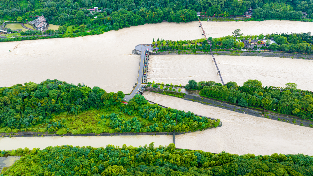 (2024年7月24日,近十年最大洪峰过境都江堰渠首鱼嘴图。都发中心供图)