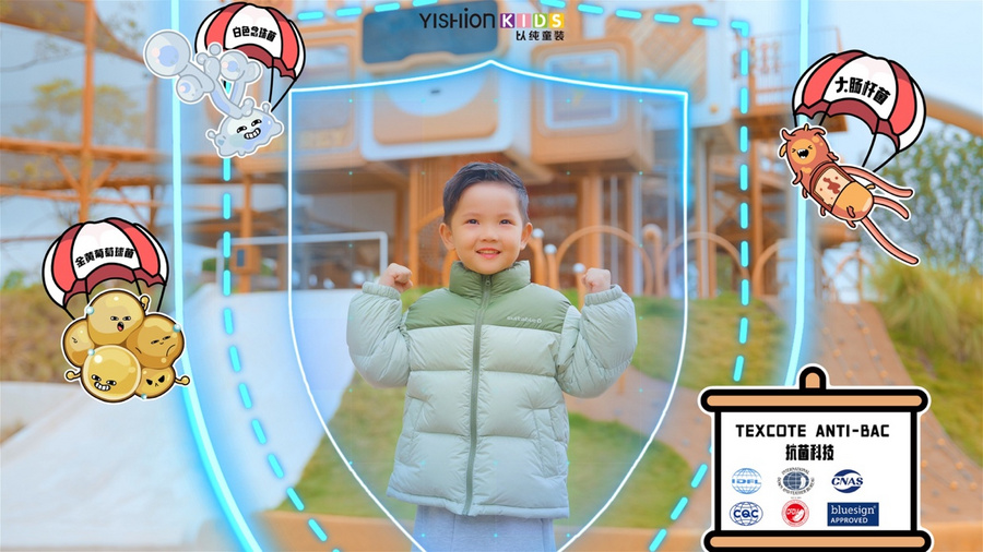 冬季儿童穿羽绒服,家长常面临 “两难困境”:选保暖性强的,儿童活动时后背易闷汗,汗湿后着凉风险更高;选轻薄款的,腹部等核心区域又难以抵御冷空气,易受寒感冒。以纯童装深刻洞察这一痛点,创新性地将 “分区充绒技术” 与 “TEXCOTE ANTI-BAC 抗菌科技” 结合,打造 “科学温暖 + 持久抗菌” 的双重防护体系,为儿童冬季穿着解锁 “动态平衡” 的舒适体验,成为童装功能创新的典范。