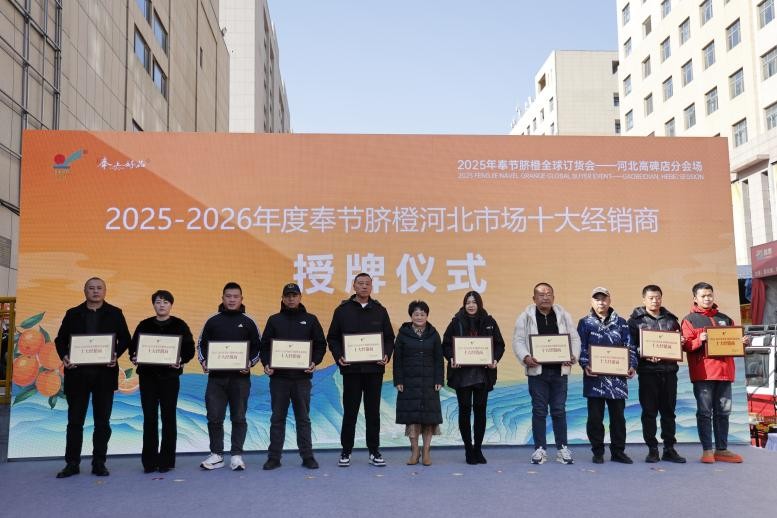 活动现场还举行了直营店揭牌与十大经销商授牌仪式,标志着奉节脐橙在华北市场的渠道体系进一步完善。