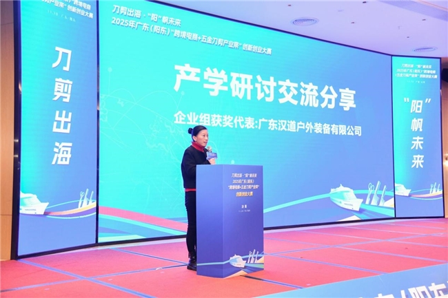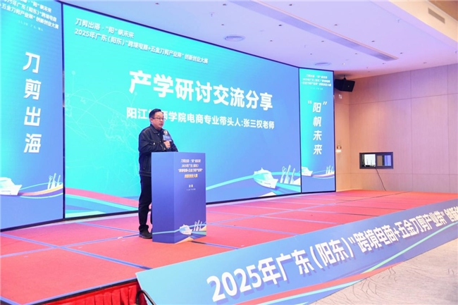 在产学研讨交流环节,团队组获奖代表、【阳江锋镝】项目负责人辛昊翔分享了年轻团队深耕跨境细分赛道的创业心得,介绍了项目在产品差异化设计与海外社群运营中的创新做法。企业组获奖代表广东汉道户外装备有限公司负责人,结合企业深耕户外刀具领域的实践经验,阐述了传统制造企业通过跨界营销、品牌数字化转型实现跨境突围的路径,其与影视IP合作提升品牌曝光度的案例引发广泛共鸣。阳江技师学院电商专业带头人张三权老师则从人才培养角度出发,分享了校企合作共育跨境电商复合型人才的模式与成果,为产业发展提供智力支撑方案。三场干货满满的分享,搭建了产学研用深度交流的桥梁,为产业协同发展提供了多元思路。