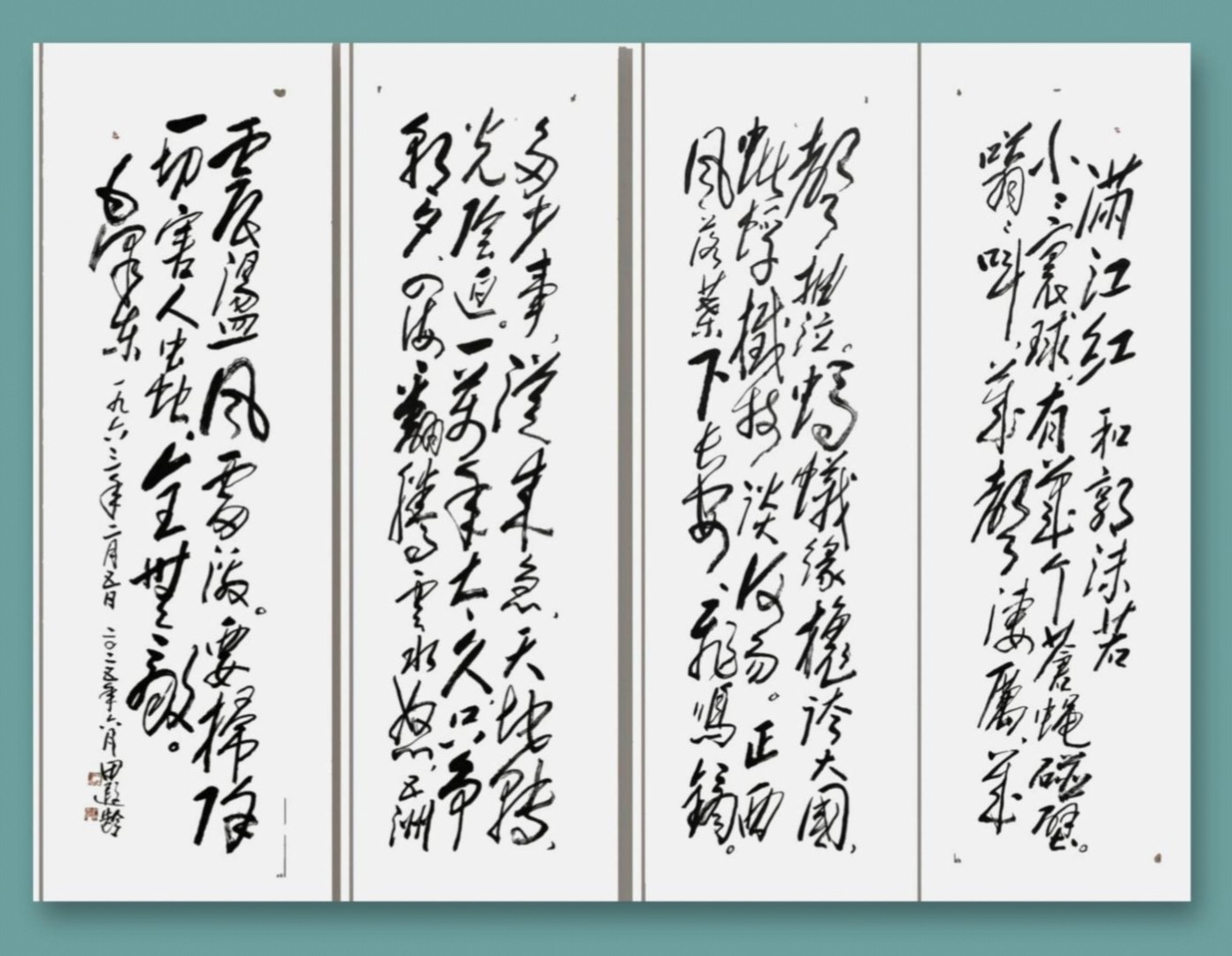 他的书法作品,尤其是毛体书法,以其雄浑豪放、大气磅礴的风格备受瞩目。毛体书法作品入选欧洲法、德、比利时、荷兰等国邮票,这一成就不仅是对他书法水平的高度认可,更是中国书法艺术在国际舞台上的一次精彩展示。他的草书作品,笔墨纵横捭阖,线条流畅自然,既有古人的典雅韵味,又有个人的创新与突破。在章法布局上,他巧妙地运用疏密、虚实、轻重等对比手法,营造出强烈的节奏感和韵律感,使观者仿佛置身于一场视觉的盛宴之中。
