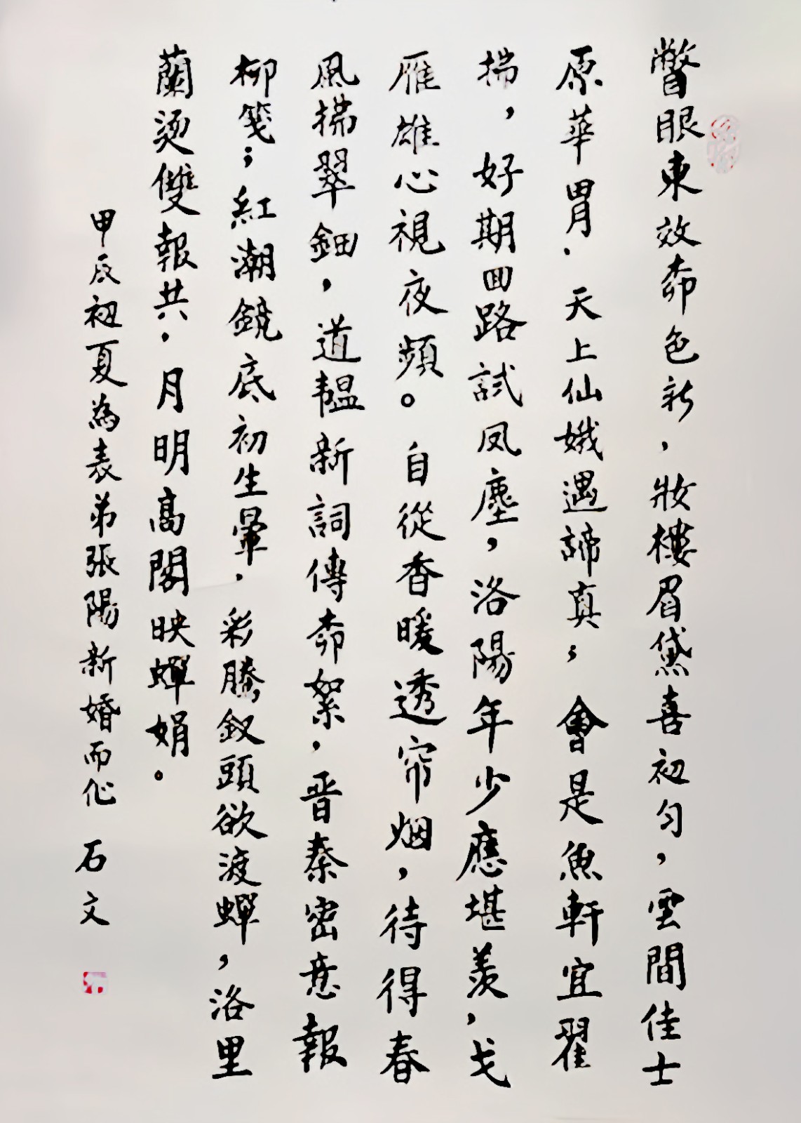 石文的绘画作品同样独具特色。他将书法的笔墨技巧融入绘画中,使绘画作品具有书法的韵味和节奏感。在题材选择上,他善于从生活中汲取灵感,描绘身边的人和事,使作品具有浓厚的生活气息。同时,他也注重对传统文化的传承和弘扬,在作品中融入诗词、典故等元素,增添了作品的文化内涵。例如,他的书法作品《古诗四条屏》,以书法形式展现古诗的韵味,将诗词的意境与书法的神韵完美结合,给人以美的享受。