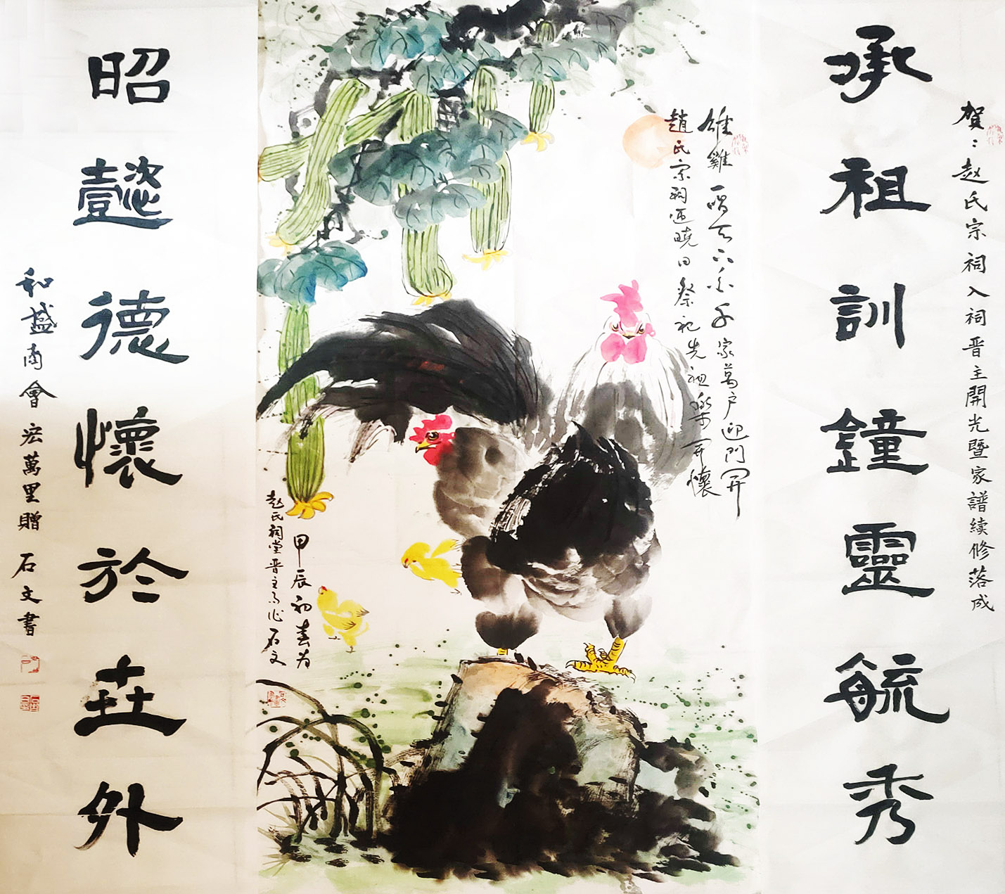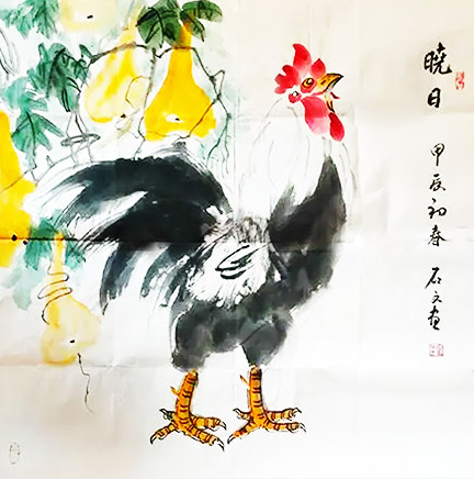在绘画方面,石文同样勇于突破。他不断尝试新的绘画题材和表现手法,将书法与绘画相结合,创造出独特的艺术效果。他的绘画作品,无论是山水、花鸟还是人物,都充满了生机与活力,展现出他对生活的热爱和对自然的敬畏。例如,他的山水画《鸿运当头》,以浓墨重彩描绘出山川的壮丽景色,红色的山峦象征着吉祥与繁荣,给人以强烈的视觉冲击;而他的花鸟画《闻鸡起舞》,则以简洁而生动的笔触,勾勒出公鸡的雄姿,寓意着积极向上的精神风貌。