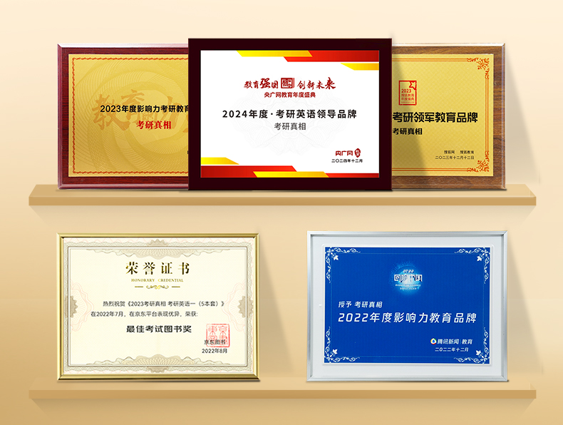截至目前,“考研真相”系列图书年发印量高达约439.9万册,长期位列京东、天猫等平台考研英语类图书畅销榜前列,并多次荣获行业奖项,包括京东图书“最佳考试图书奖”、央广网“2024年度考研英语领导品牌”、搜狐教育“2023年度考研领军教育品牌”、新浪教育“2023年度影响力考研教育品牌”、腾讯教育“2022年度影响力教育品牌”等。