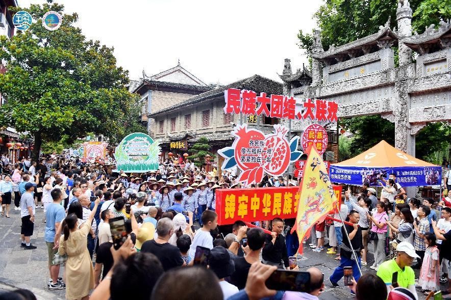 7月22日上午7时,在青龙洞正山门举行祭龙仪式,祈求风调雨顺、国泰民安。随即由各乡镇及社区组成的文化特色方阵开启了热闹非凡的陆上游行。欢天喜地的特色文化游行方阵完美的展示了镇远县社会发展、历史文化、民族风情。巡游队伍沿着古街道行进并与群众互动,观众山呼海啸,整个古城满是欢腾喜悦的氛围。