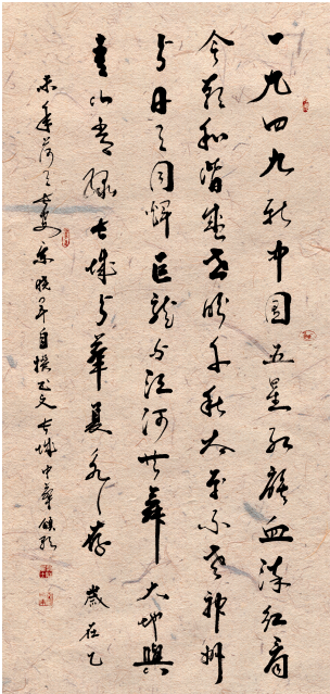 积极倡导两岸永远和平,国家尽早统一,挥毫为台当局要人作书:“春江有月明两岸,秋水无波行一舟”。受到两岸文化学者的高度赞赏……