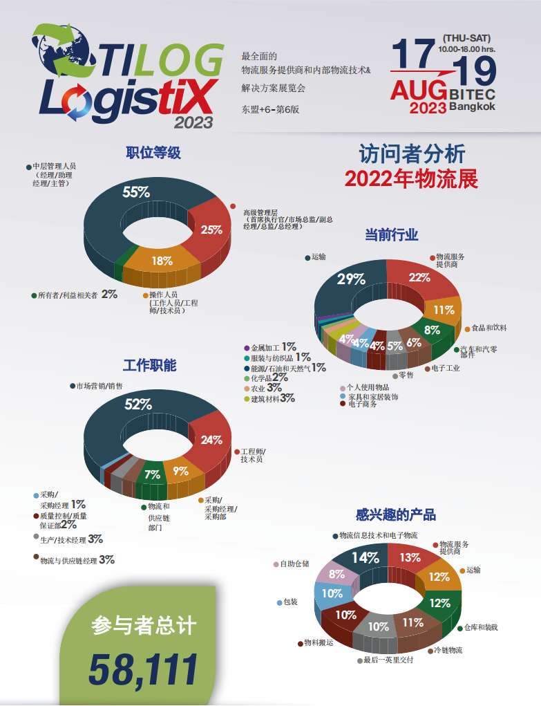 泰国商务部国际贸易促进厅和东盟领先的展会组织方泰国励展展览有限公司(RX Tradex) ,将于2023年8月17-19日在曼谷国际贸易展览中心(BITEC) 98号厅,联合举办“2023泰国国际物流展”(TILOG-LOGISTIX 2023), 这也是东盟十国和中国、日本、韩国、印度、澳大利亚和新西兰 6国关于物流供应商、内部物流技术与物流解决方案最全面的展会。