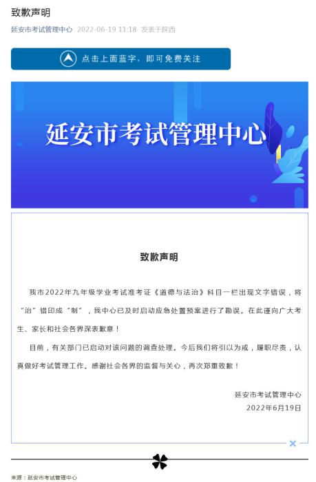 小编导读: 中新网6月19日电 延安市考试管理中心19日在微信公众号发布致歉声明。声明称,延安市2022年九年级学业考试准考证《道德与法治》科