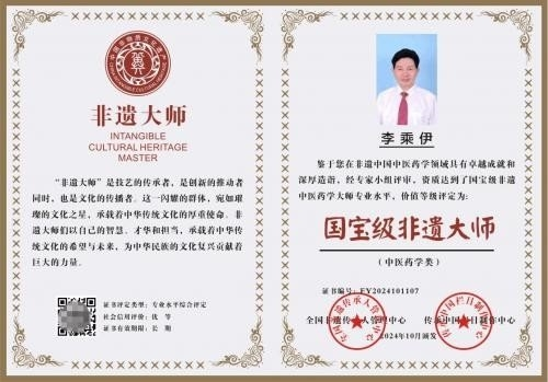 在非遗中国中医药学领域资质达到了中医药学大师专业水平,被评定为国宝级国宝级非遗大师。