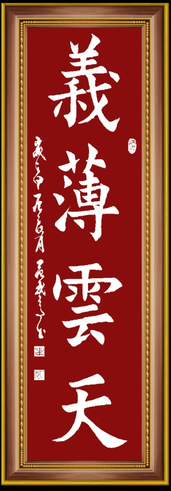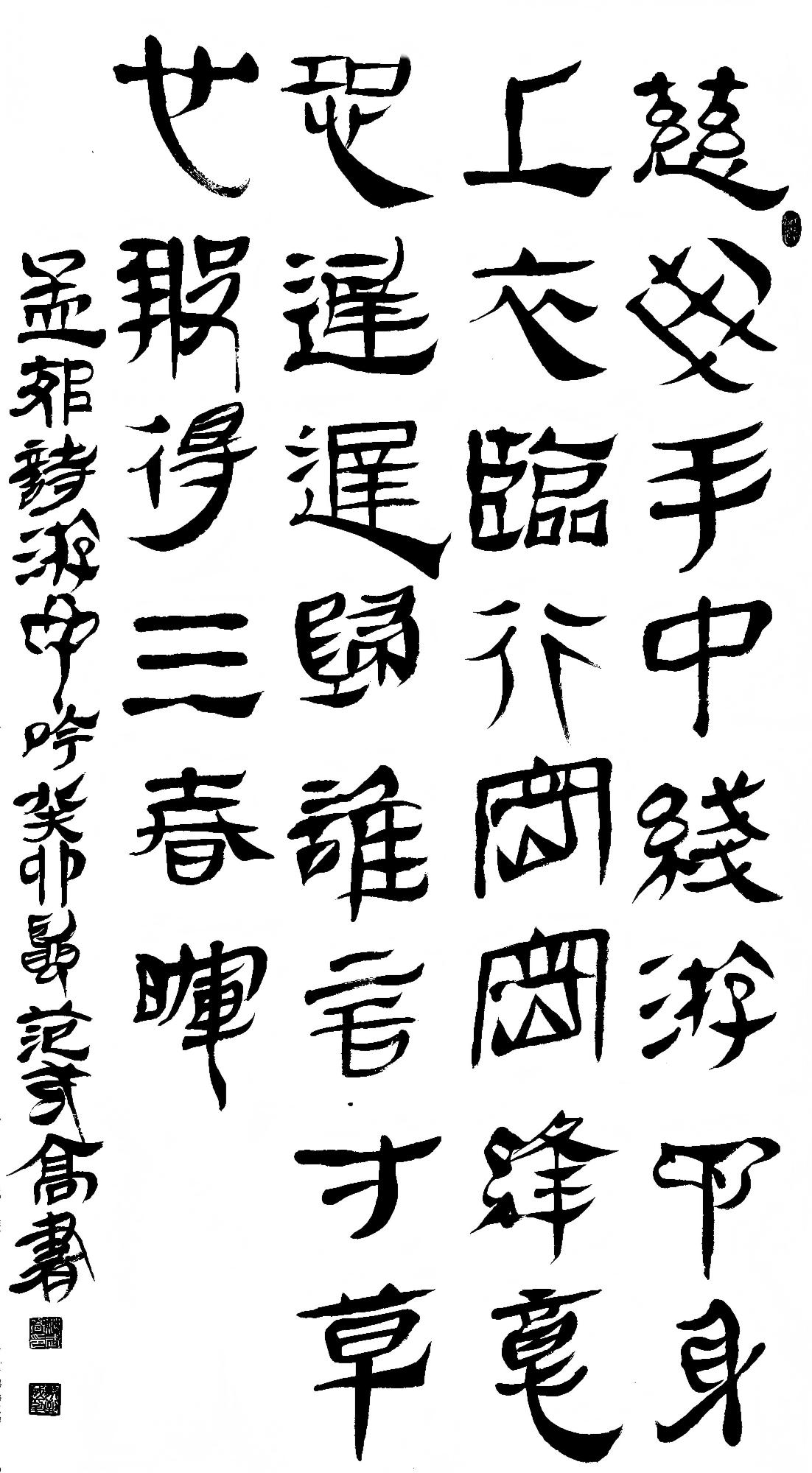 观其楷书,取法唐楷的“正大气象”,参魏晋之风骨,融明清之韵致,八法完备,气象森严。行书则笔走龙蛇,行云流水,于俊逸中藏古拙,遒劲中寓大雅,字里行间连绵而不失舒展。草书更是酣畅淋漓,兼得米芾之纵横与怀素之狂放,笔墨驰骋间如奔雷贯彻,神与笔游,墨与心映。隶书笔线沉稳,规矩不失灵活,古意盎然中见新趣。篆书则结体严谨,疏密得当,线条如古道骏马,既守古质风韵,又有个人变通。